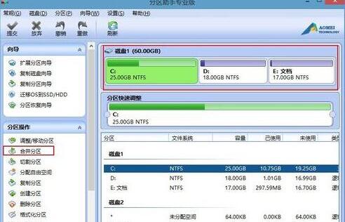 3、紧接着我们需要运行打开分区助手,然后随意选择一个磁盘并选择左侧功能栏的“合并分区”选项。