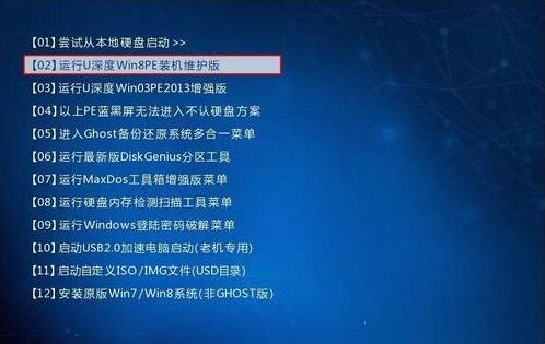 U盘启动盘与电脑相链接,连接后重新你的电脑。重启时在出现品牌logo时按下相应的U盘启动快捷键,然后选择U盘启动进入到u深度主菜单处。在主菜单处我们选择【02】并回车,如下图: