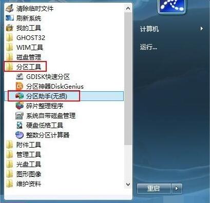 2、借助分区助手专业版进入到到PE系统后,根据下图中提示找到【开始】——【分区工具】——【分区助手】选项并进入。