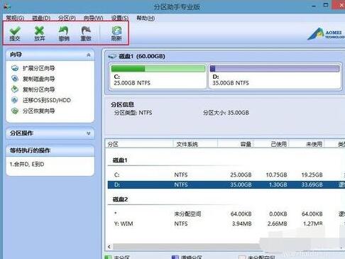 5、确认合并分区之后可以在下图汇总左下角的位置看到“等待执行的操作”提示,如下: