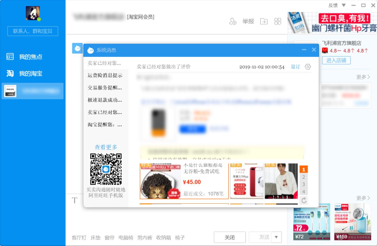 10、聊天窗口微店铺:聊天的同时可以在聊天窗口右侧浏览宝贝详情,管理交易订单,了解更多推荐的宝贝,查询购物车;