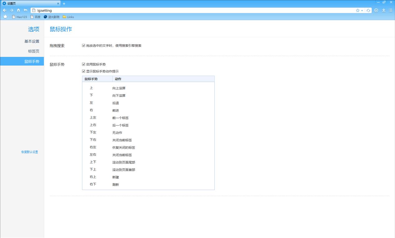 鼠标手势:按住鼠标右键比划一下就可以执行如前进、后退等常用的操作,大大提高了鼠标利用率。用户还可以在设置中心里面修改和添加其他用户想要的动作。