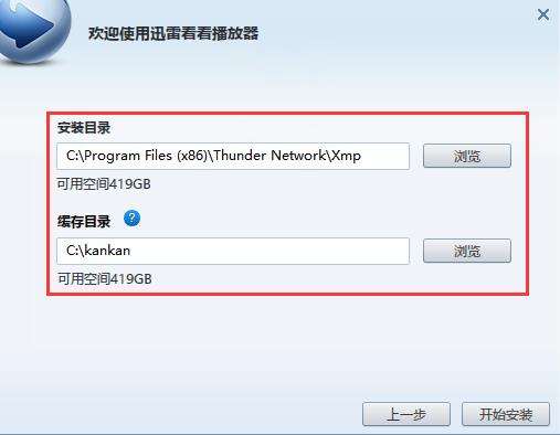 3、为迅雷看看播放器选择一个合适的安装位置:默认是安装在C盘目录下的,可点击浏览选择其它非系统的安装目录。再设置一下缓存目录再点击开始安装即可。
