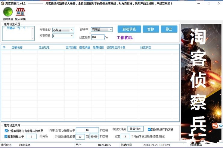 采集店铺信息,包括店铺名称、店主旺旺、宝贝数量、整店销量、隐藏链接、已提取宝贝数量、侦查状态等等,需要的店长可以下载使用。门路淘宝侦查兵是淘宝高效排除投诉的一种方式 ,适用于淘宝客卖家,是目前