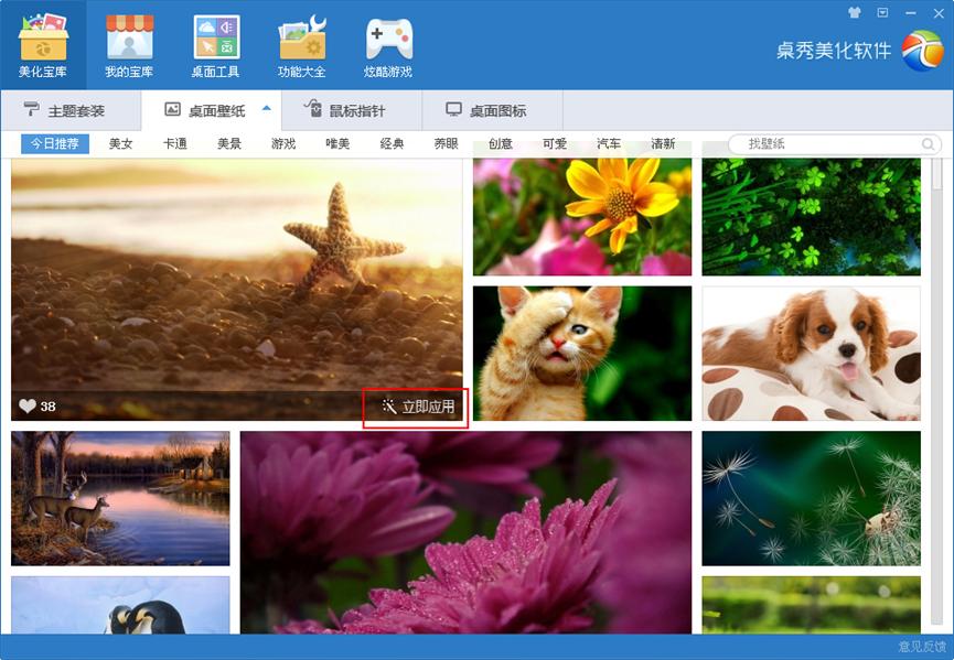 可以再美化宝库里下载桌面主题,然后下载管理里面直接应用。也可以在分享秀场中直接点击应用。