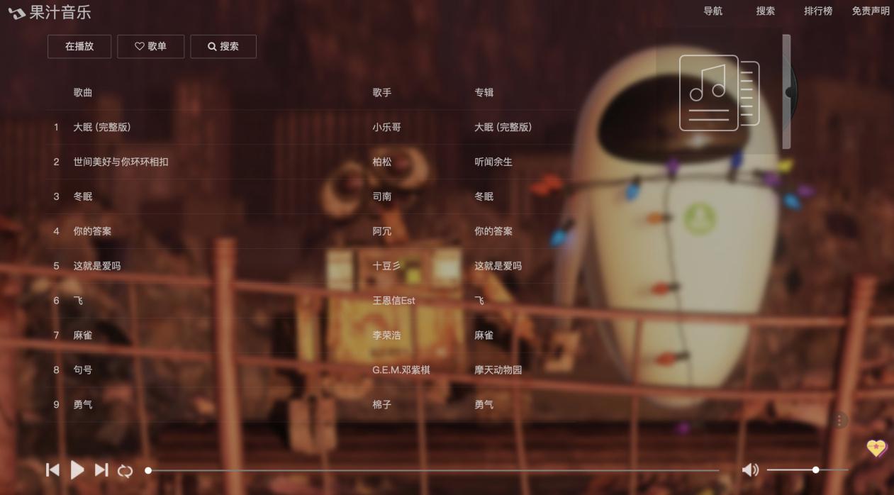 清酒踏月在线音乐,所拥有的音乐是比较丰富的,基本上主流的三大音乐平台的音乐里面都有,另外它同样也支持免费听歌和免费下载。整个界面在设计上较为精简,提供了"播放列表",也提供了"歌曲搜索",可以直接通过这两个功能进行搜歌。