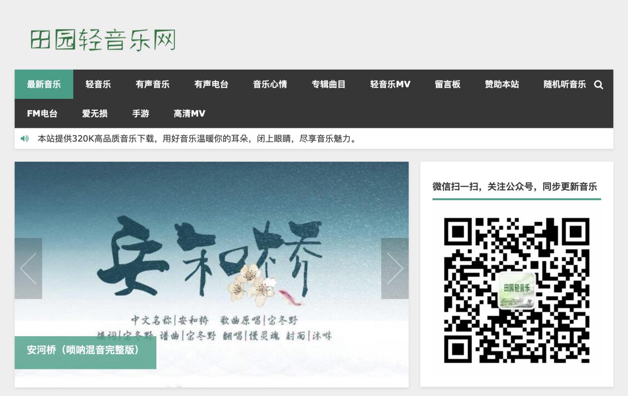 田园轻音乐网,这个音乐网站拥有的歌曲是真的多,并且还作了详细的分类,分别是:最新音乐、轻音乐、有声音乐、有声电台、音乐兴趣、专辑曲目、轻音乐MV等等。