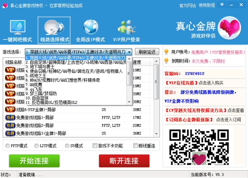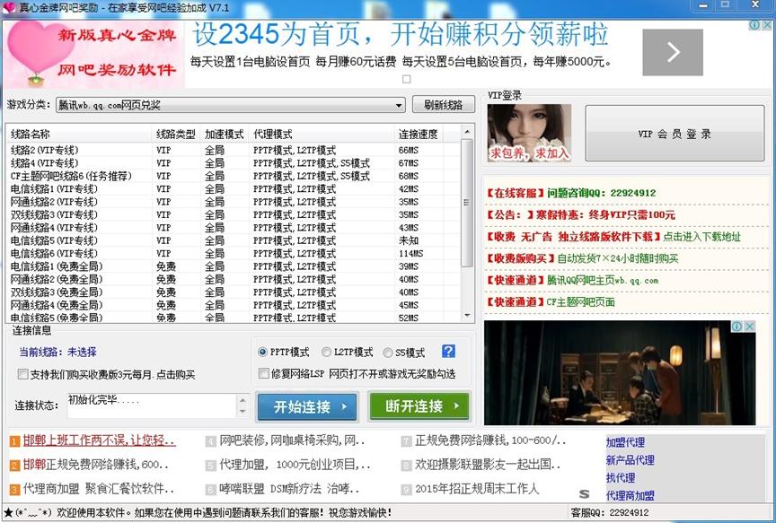 真心金牌网吧代理软件简洁界面,打开软件。选择金牌网吧线路,再点击连接按钮,进游戏即可实现QQ金牌网吧奖励需求。