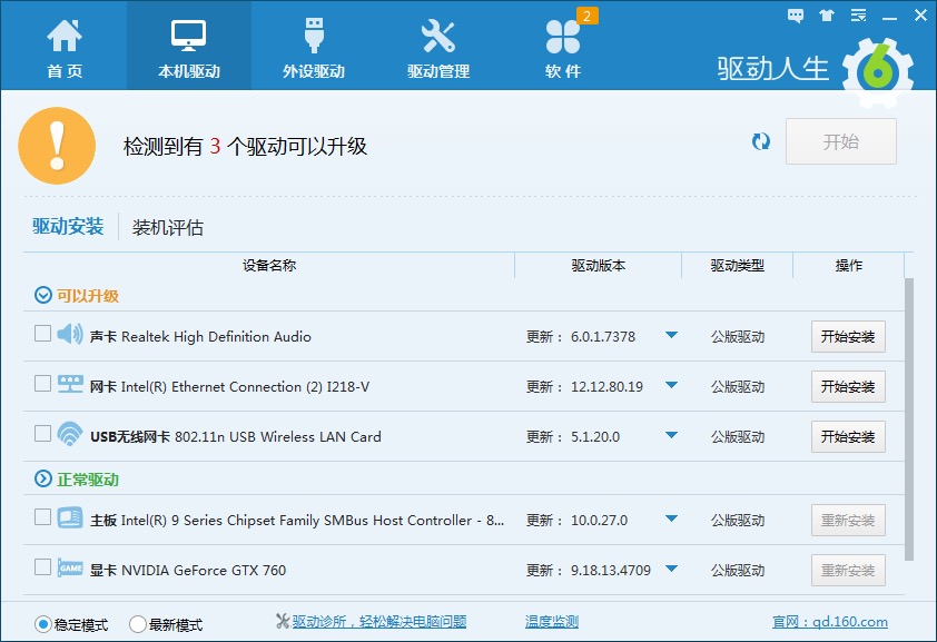 驱动人生电脑版版本非常易用,采取“一键检测”式逻辑结构进行设计,全自动检测当前系统类型和判断驱动缺失情况,全程用户只需要点击一个按钮便可完成驱动安装,连“小白”用户也不会无所适从,按下“一键安装”按钮就能一键解决所有重装系统后的驱动问题。