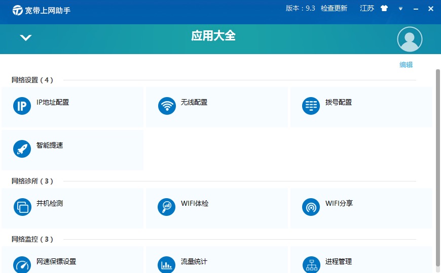 视频测速、智能提速、电脑拨 号故障处理、家庭网关无法上网故障处理和网速慢、常掉线检测、无线网络诊断等功能