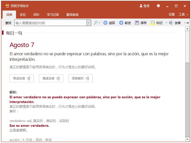 西班牙语助手是为西班牙语学习者特别设计的语言学习软件。西班牙语助手不仅是一款西汉词典软件,而是完整包含了西汉、汉西、、西英词典、动词变位查询、西班牙语发音等功能,并附有西班牙语智能输入器、生词本等实用软件,西班牙语助手是西班牙语学习者必不可少的辅助工具。