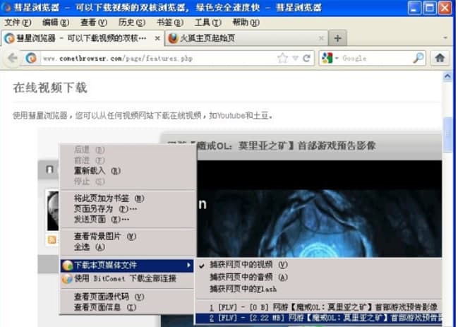3.要在线下载视频,请右键单击视频播放窗口,选择要下载的在线视频,音频和Flash动画,然后让Comet浏览器完成它。