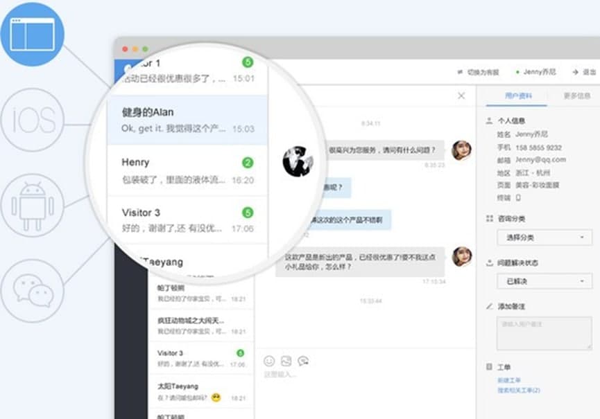 客户反馈可以收到,不管客户是否在线,表情,图片,语音,订单发送让交流更加有效。