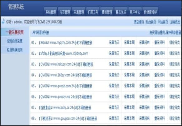 4.有很多数据和信息。飞飞影视系统背后的默认设置,完善了数据信息的API共享功能。所有飞飞站都可以作为资源网站呈现API网络服务,只需在后台管理中添加一个网站,一键API即可收藏。