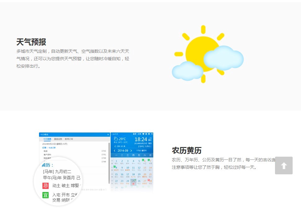 1. 农历、公历及黄历查询功能:在该软件中出来提供有基本的公历查询功能之外,还能够直接查询农历和黄历,在黄历中还为用户提供有详细的干支历、生肖、宜忌信息,用户在查询过程中一目了然,能够更快的进行当前日期的详细了解。