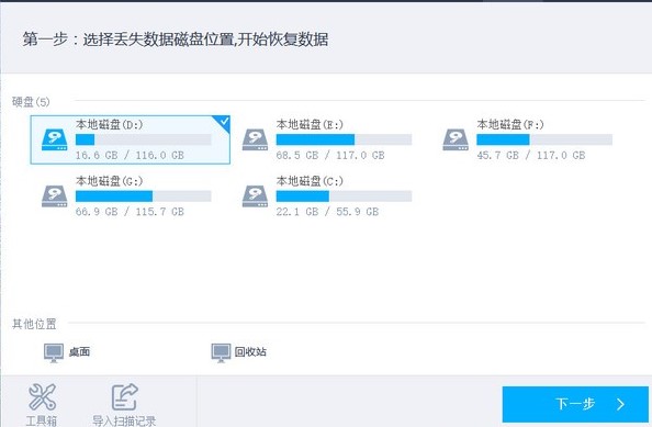 选择需要恢复的硬盘分区,(如果外接设备,请在运行软件前连接好),点击“下一步”开始扫描。