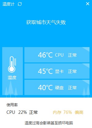 海狸温度计作为一款简单易用的电脑温度计软件,运行后不仅可以对电脑中所有硬件信息温度进行全面扫描,比如CPU温度、显卡温度、硬盘温度等,并且详细的展示在软件界面;而且还能显示本地的天气以及内存使用情况。