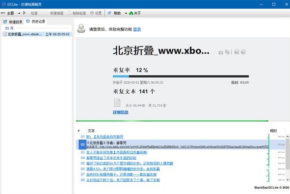 DC Lite抄袭检测精灵电脑版简洁清爽的界面,几乎不需要任何学习,通过”打开文章“按钮或”粘贴文章“按钮将文档载入编辑区后点击”检测“即可。程序自动对文章切分片段,实时回报检查情况。