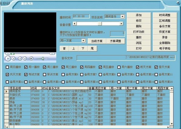 2、课间、操后、早餐、午餐、晚餐可自动播放音乐,播放时长可任意设置,可连续自动播放多首曲目,目录播放可随机连续播放某一目录中的所有音乐文件,每次播放顺序都随机产生,次次不相同,次次都新鲜。此功能尤其适用于校园广播、课间音乐、宾馆、饭店、茶社、超市播放背景音乐,也 可用于中小型广播电台的节目播放。