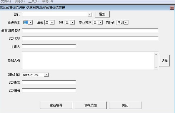 亿愿制药GMP教育训练管理软件是为药品生产企业符合《药品生产质量管理规范(GMP)》专门设计的,用于企业人员培训管理工作的软件,软件包括部门的添加修改删除,人员的添加修改删除,教育培训记录的添加修改删除,包含SOP的名称、版次、编号等,查询方面非常专业,可以对单个栏目查询,也可以对全部栏目查询,支持精确查询和迷糊查询,支持时间段查询,支持多个关键词同时查询等方式;