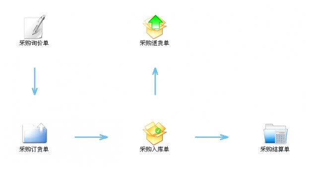 采购管理:以采购询价单、采购订货单、采购入库单、采购退货单、采购结算单等业务流程,进行公司物资采购信息管理。