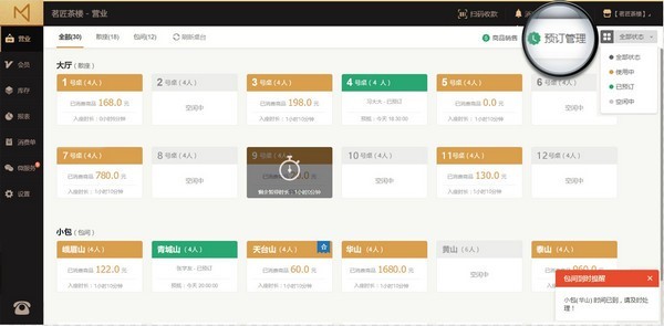 商品参与库存管理,例:客人消费一杯茶,系统自动扣减一包库存,做到帐物相符,便于财务管理,同时避免服务员销售过 程中不计库存的现象。