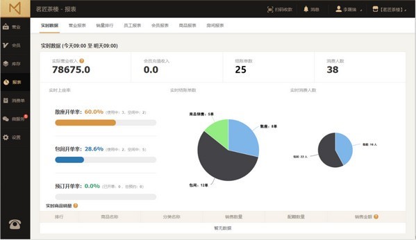 老板手机端随时随地查看营业数据和经营报表,可按天/月/季度查看营业走势分析、商品销量排行,帮助老板准确掌握门店 经营情况,及时调整经营策略。