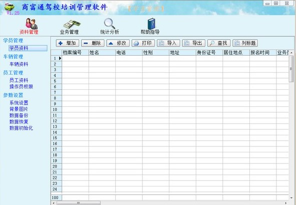 商富通驾校培训管理软件是一款非常专业的驾校培训管理系统,针对中小型驾校学员管理精心设计,避免重复工作内容,提高工作效率,节省大量宝贵时间;界面美观大方,功能强劲实用,能够对学员的资料进行新增,编辑,删除等操作,使用起来简单便捷。