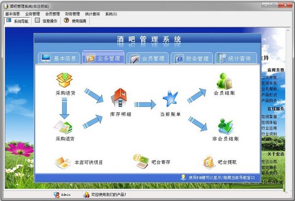 宏达酒吧管理系统是功能强大,专业实用的酒吧管理应用程序。宏达酒吧管理系统应用程序界面美观大方,具有基本信息、业务管理、会员管理、财务管理、统计查询等功能,使用方便。