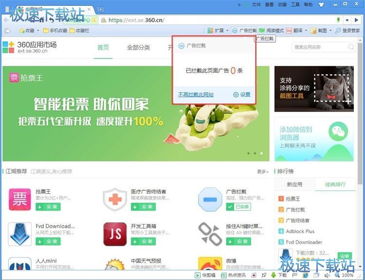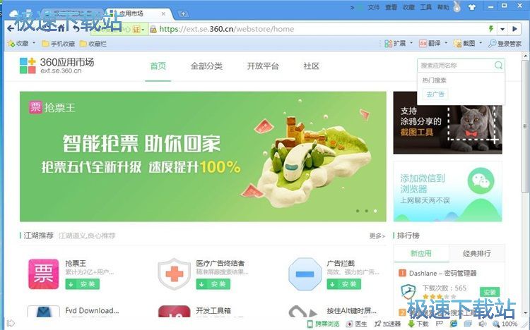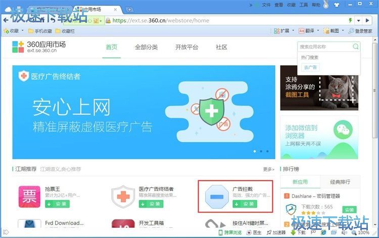 进入360安全浏览器的浏览页面。相信很多人都被网页广告坑了不少,不小心点进去了还有广告中捆绑的几个广告同时弹出,非常烦人。今天极速小编就教大家怎么使用360安全浏览器的扩展功能实现拦截广告。点击收藏栏右边的扩展展开菜单,点击[扩展中心]进入扩展中心页面;