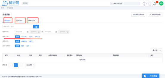 请假功能的价值主要是数据留痕,以前我们请假需要写假条,学生还需要跑流程。但是时间一长,假条容易找不到,而且也不利于学生数据留存。现在点开请假模块,已审批,待审批、请假记录模块都很清楚。