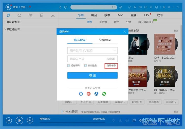 极速小编正想使用酷狗音乐下载音乐,但是需要登录酷狗音乐账号才能下载。极速小编还没有酷狗音乐账号。这一次就给大家演示一下怎么注册酷狗音乐账号。点击酷狗音乐账号登录界面中的注册账号;