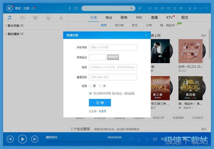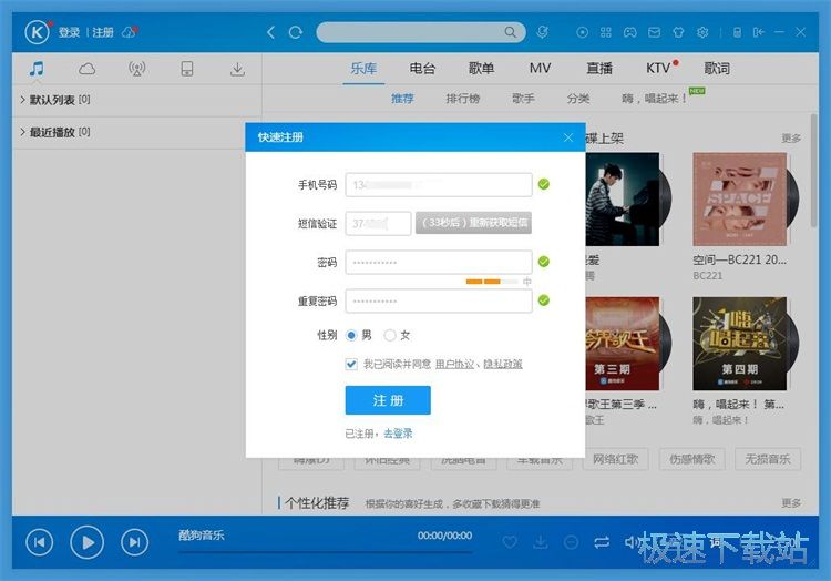 酷狗音乐账号注册界面已经为我们勾选了我已阅读并同意用户协议、隐私政策。根据酷狗音乐账号注册界面的提示和要求填写好注册信息后,点击注册就可以提交注册信息,注册账号了;