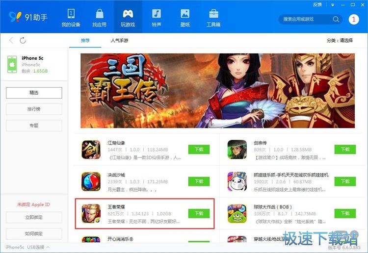 在91助手手机游戏中心,我们可以找到各种好玩的手机游戏。极速小编看到了91助手游戏中心中有火热的手机游戏王者荣耀。点击游戏图标进入游戏详情页;