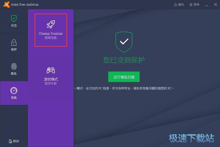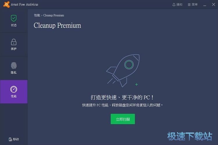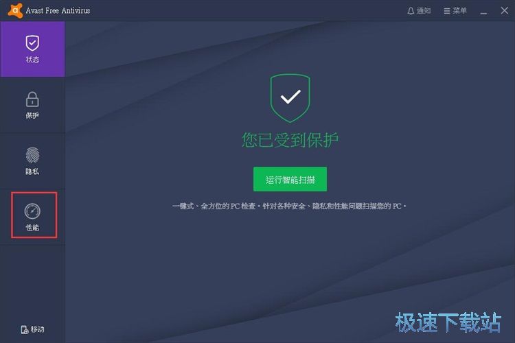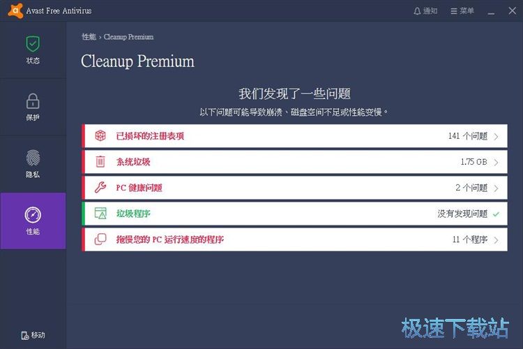 极速小编这一次就给大家演示一下怎么使用Avast Free Antivirus对扫描电脑系统中的可优化项目吧。点击Avast Free Antivirus主界面左边功能分类中的性能,打开系统性能设置;