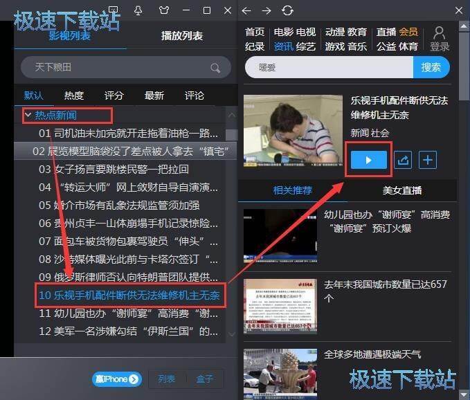 如果你想看在线视频,选择影视列表,这里有海量的在线视频观看。极速小编选择了其中的热点新闻项目,点击展开后选择感兴趣的视频,最近乐视的新闻好像挺大的,极速小编也来看看乐视的新闻。选择标题后资讯窗口会自动弹出,这时候只需点击这里面的播放窗口,就可以看到想看的视频了;