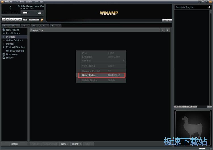 极速小编这一次就给大家演示一下怎么使用Winamp播放本地音频并将音频添加到Winamp的播放列表中吧。我们要在Winamp中新建一个播放列表。点击Winamp主界面左边的Playlist播放列表,打开播放列表界面;