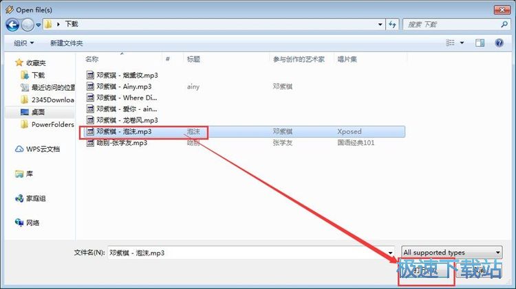 在文件浏览窗口中。根据音乐文件的存放路径,找到想要使用Winamp播放的本地音乐文件。点击选中文件后点击打开,就可以将音乐导入到Winamp中;
