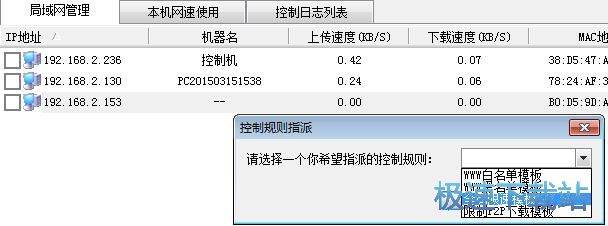 回到主界面,我们看到局域网内有3台设备,其中一台是没有名字的设备,双击该设备,弹出控制规则指派页面,选择[全局限速模板],点击确定完成规则指派,这样就可以限制那台设备的网速了!