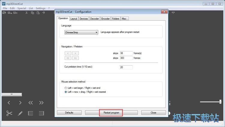 语言选择完成后,就可以点击软件配置窗口底部的Restart program重新启动软件,就可以重新启动软件,使软件语言设置生效;
