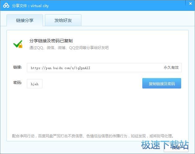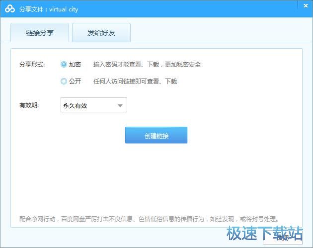 这时候,百度网盘会弹出分享文件设置窗口,你可以选择你想要分享的文件是想要通过连接方式还是直接发送给好友。极速小编今天演示一遍链接分享,我们可以选择加密分享或者公开分享,加密分享需要密码才能下砸文件,隐私性和安全性都更高,选择好之后,点击[创建链接];