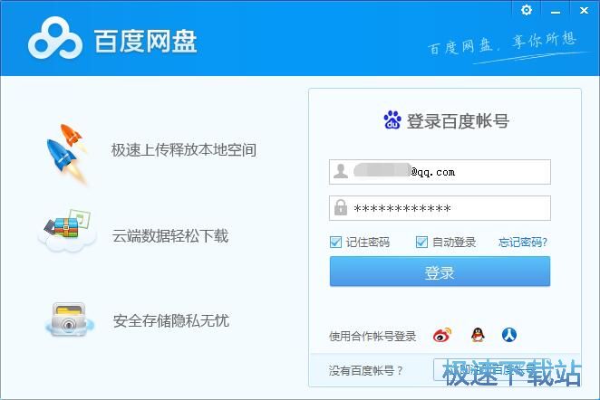 使用百度网盘,首先需要登陆百度账号,如果没有百度账号,也可以使用新浪微博、腾讯QQ、人人网这三个合作账号登陆;