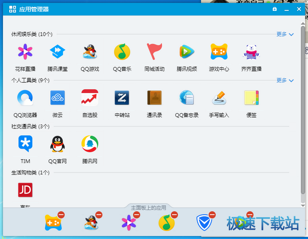 想安装更多QQ软件吗?我们点击右下解的“方格”,出现应用管理器界面,这里可以轻松找到所有QQ软件游戏,点击一下即可下载安装;