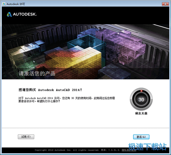 5、返回“产品许可激活选项”页面,将算出的数字粘贴到第一个激活码文本框中,点击“完成”即可完成AutoCAD 2014的激活,感谢你对极速下载站的支持!