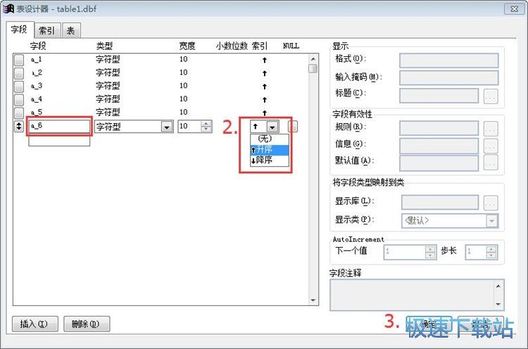 在表设计器中,我们要输入字段,表设计器会自动设置字段类型,字段输入完成之后需要选择索引升序或者降序,选择完成之后点击表设计器右下方的[确定]完成设计;