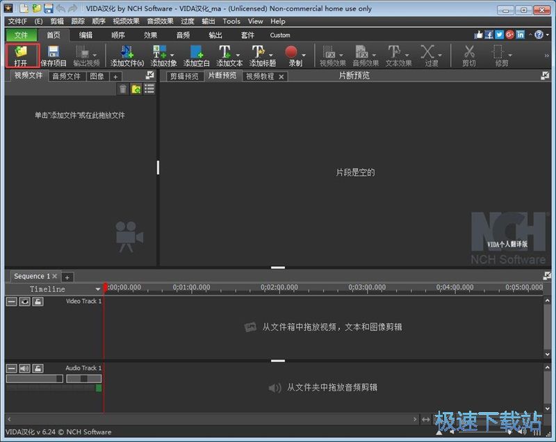 下载安装后打开软件。极速小编就给大家演示一下怎么使用VideoPad Video Editor合并电脑本地视频并添加视频效果吧。首先我们要将电脑本地视频导入到软件中。点击软件主界面左上角的打开,就可以导入视频;