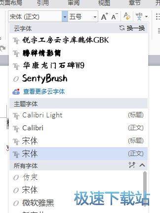 点击工具栏里的“宋体(正文)”,会显示你系统中已安装的所有字体,当鼠标移动到选项上,会显示对应的字体效果。
