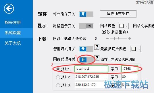 3、打开太乐地图下载器,点击左上角太乐按钮,然后在系统设置中开启代理,然后设置第一个代理地址为:locahost或者127.0.0.1,端口号设置为刚记录的17368,如下图,然后选中它,连接成功就会变成绿色,然后关闭设置窗口: