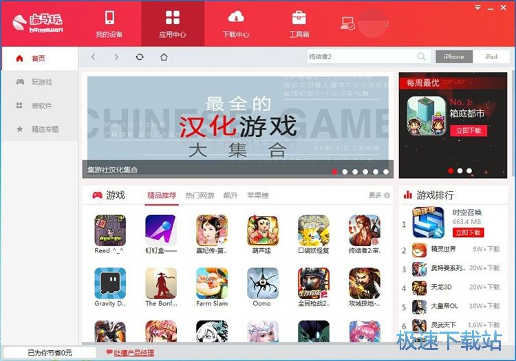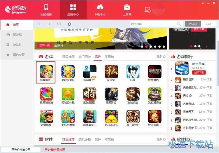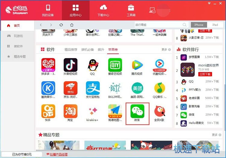极速小编这一次给大家演示一下怎么使用海马玩苹果助手安装好用的应用和游戏。点击海马玩苹果助手顶部功能栏中的[应用中心],进入海马玩苹果助手应用中心。在这里我们可以找到海量的IOS应用;