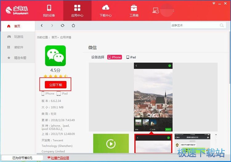 在应用详情页,我们可以查看到微信的评分、支持设备、应用版本、大小、类型和更新日期。点击[立即下载]就可以下载微信并将微信安装到手机上;